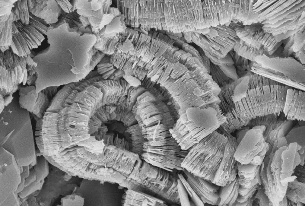 These micrographs illustrate the 'extruded' form of some kaolinite vermiforms. The 'extruded' appearance indicates than information is being transmitted via crystal growth processes with significant fidelity through many thousands of layers of clay.