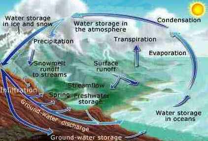 ![]() Hydrological cycle The cycling water erodes rock, causing small particles to go into solution. These particles are carried by rivers into the ocean, resulting in an increase of the level of saturation there. This in turn contributes to the formation of crystals.